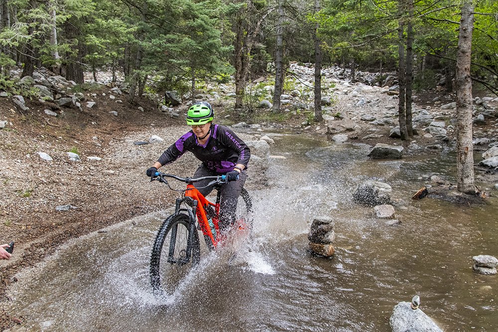 So, what’re we here for? Elizabeth Timmer is as enthusiastic a mountain biker as you’ll find anywhere. She knows her biking stuff putting on a great show for us. She drove her brilliant orange Specialized bike hard. Ride the small pools and rivulets created by Cottonwood Creek’s overflow. No problem. Jump rocks and bumps? Ditto.